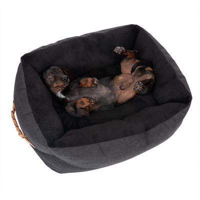 De zwarte Modern Living hondenmand Espoo zal zeker indruk maken op knuffelige honden met zijn knuffelige, dik gevoerde ligvlak. Het uitneembare omkeerbare kussen geeft je de keuze tussen een bovenblad van meubelstof of comfortabel pluche. De extra zachte, opstaande randen nodigen uit om lekker weg te kruipen en je hoofd naar beneden te doen